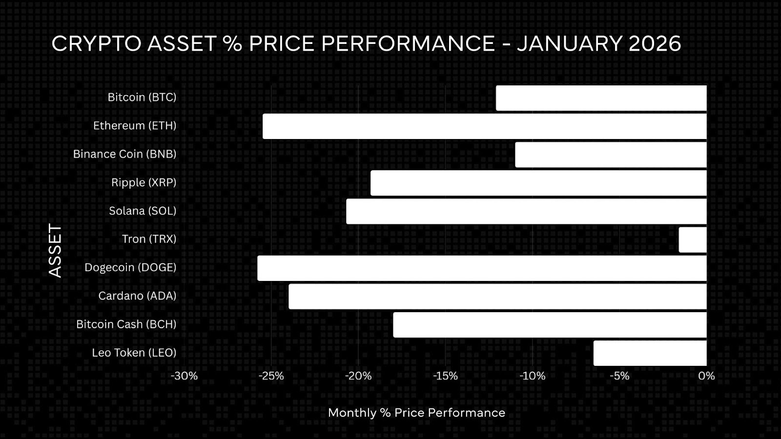 Bitcoin (BTC) finished the month down 12.1% from its December close, while Ether (ETH) dropped by 25.5%, and other popular crypto assets saw even larger corrections.