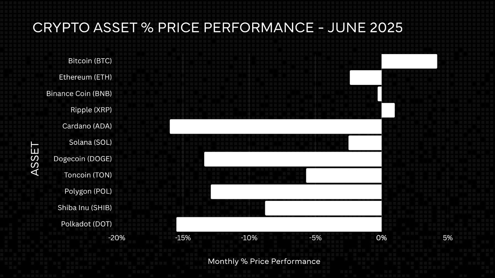 June was a disappointing month for the remainder of the crypto asset market, with more prominent assets, such as Ether (ETH), Cardano (ADA), Solana (SOL), and Polygon (POL), dropping by 2.4%, 16.3%, 2.5%, and 12.9%, respectively.