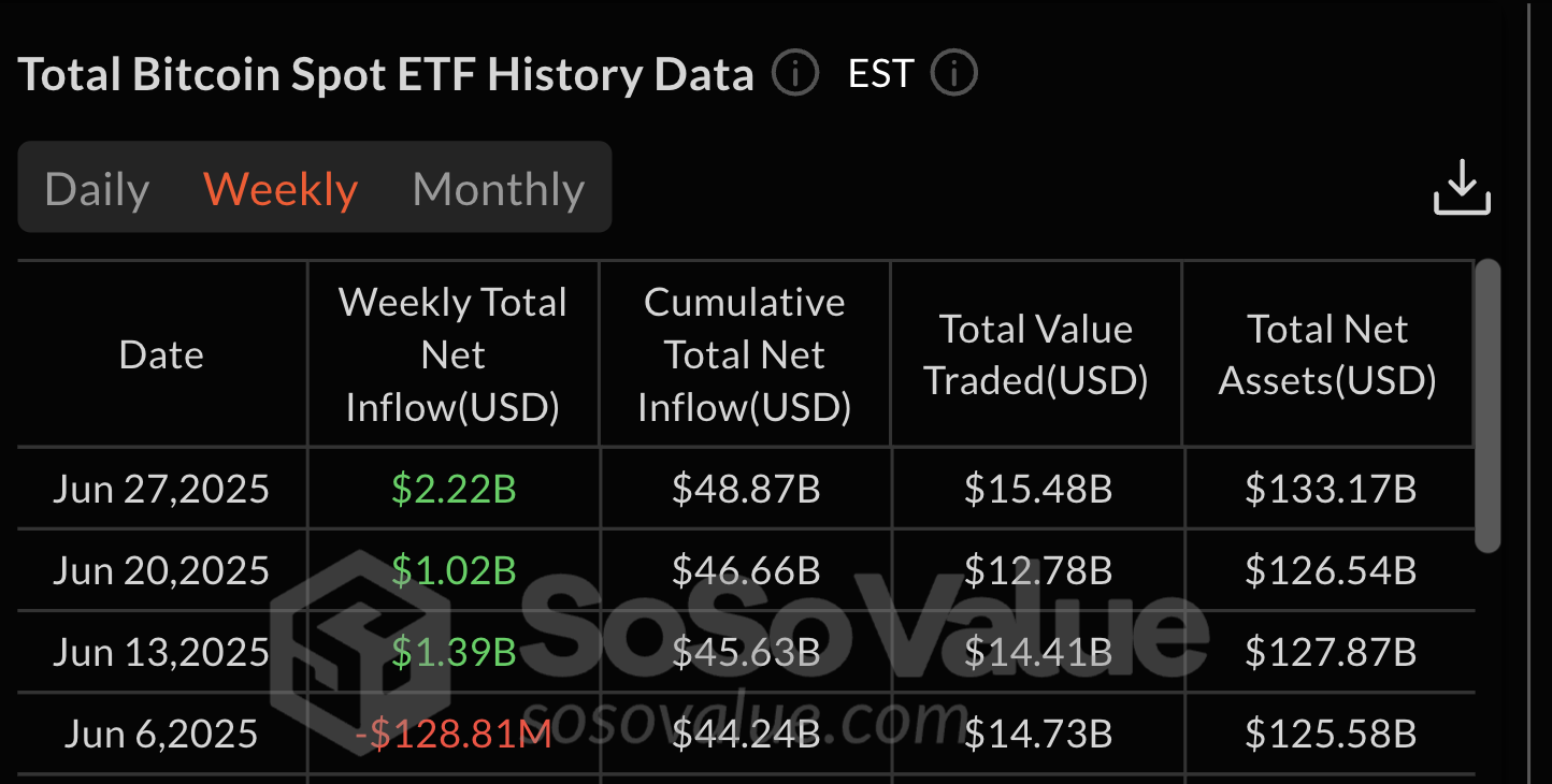 The last week of June was especially exciting because it was only the third week in 2025, when the weekly total net inflows into Bitcoin ETFs exceeded $2 billion. The other two weeks with net inflows above $2 billion happened in April and May.