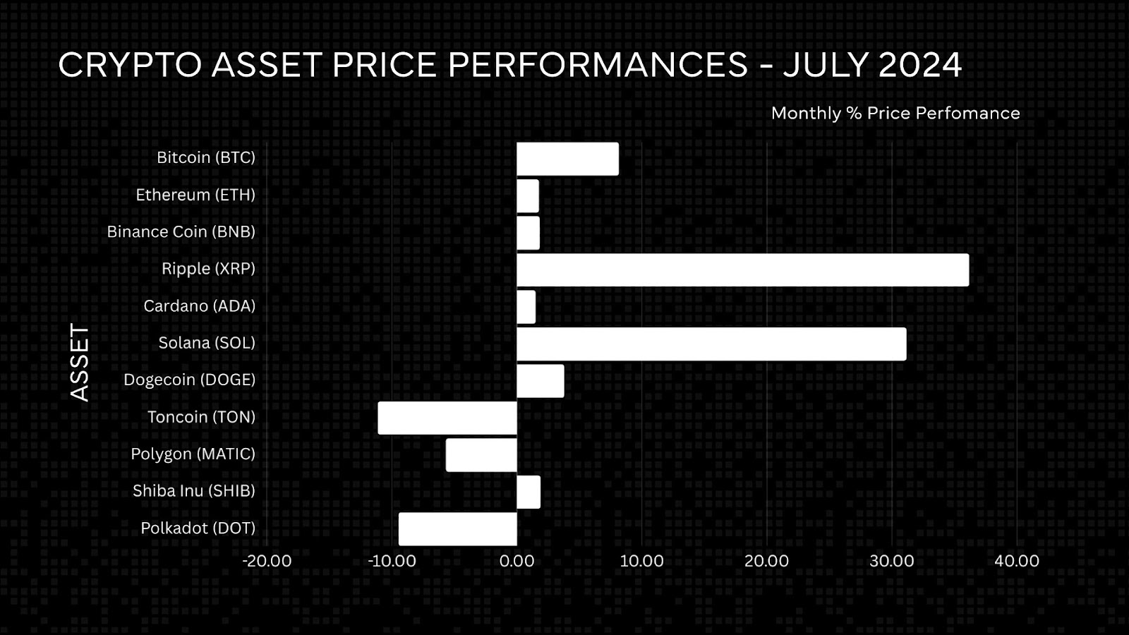 Crypto assets on the top 10 list by market capitalization finished the month with notable gains led by XRP, Solana, and Bitcoin with 36.60%, 30.94%, and 9.23%, respectively.