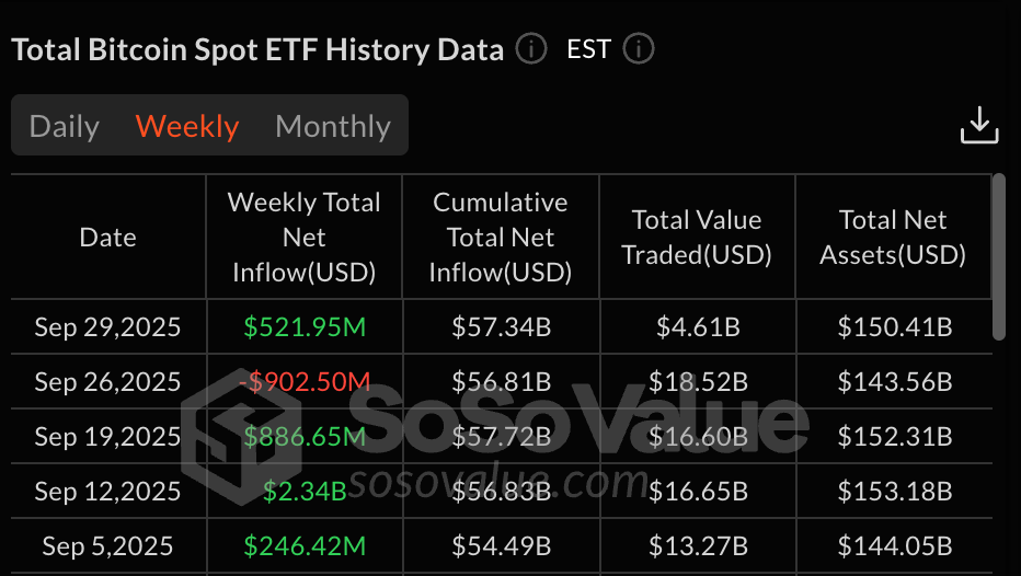 The week of September 12 was particularly notable. All funds combined had weekly net inflows of over $2.34 billion. In total, all spot Bitcoin ETFs combined hold over $150 billion in total net assets or just over 6.61% of the entire Bitcoin market cap.