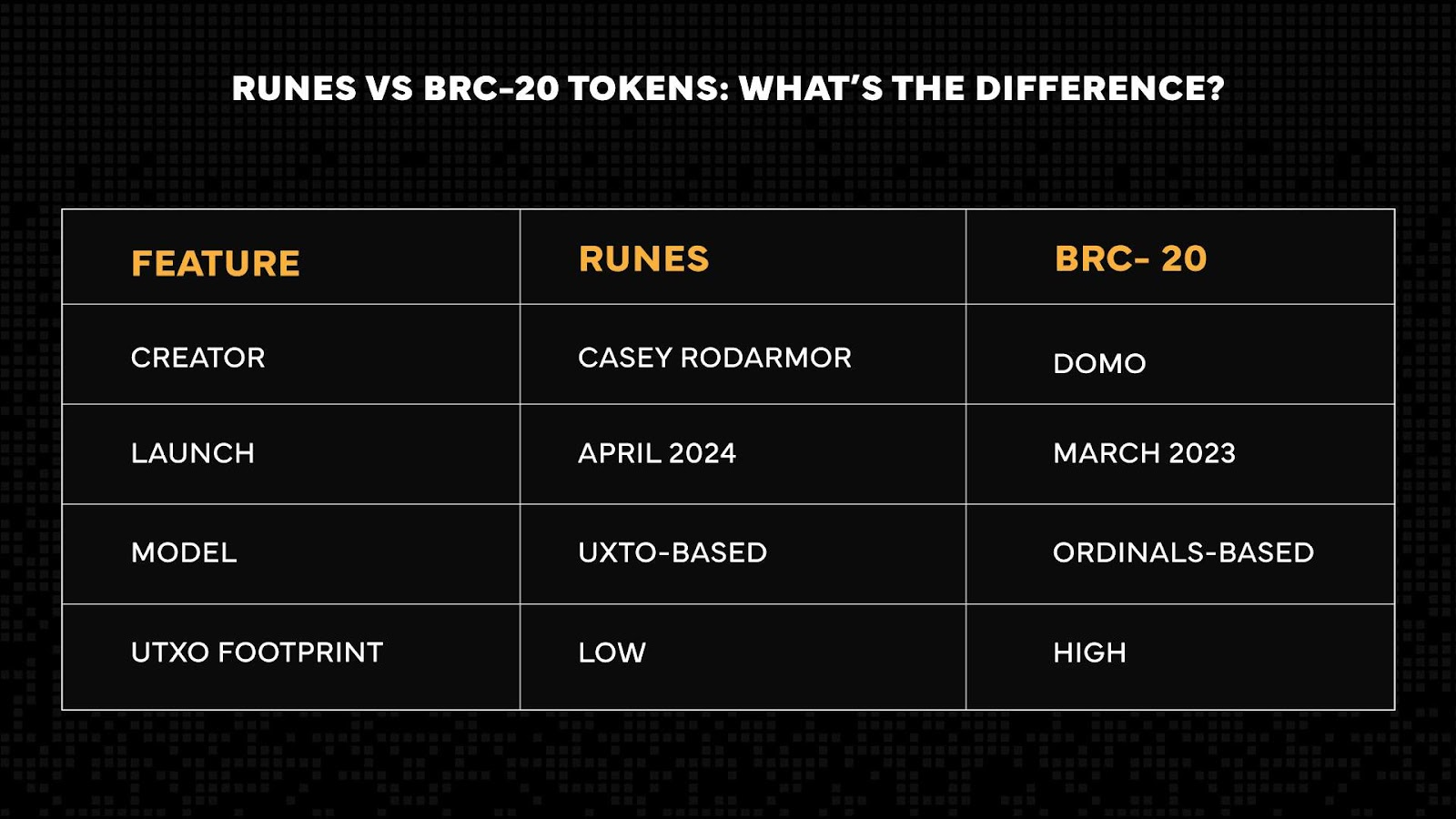 Unlike the BRC-20 protocol, which leaves behind excessive “junk” UTXOs after each transaction and therefore clogs the network, Runes uses a more efficient model for creating fungible tokens on the network.