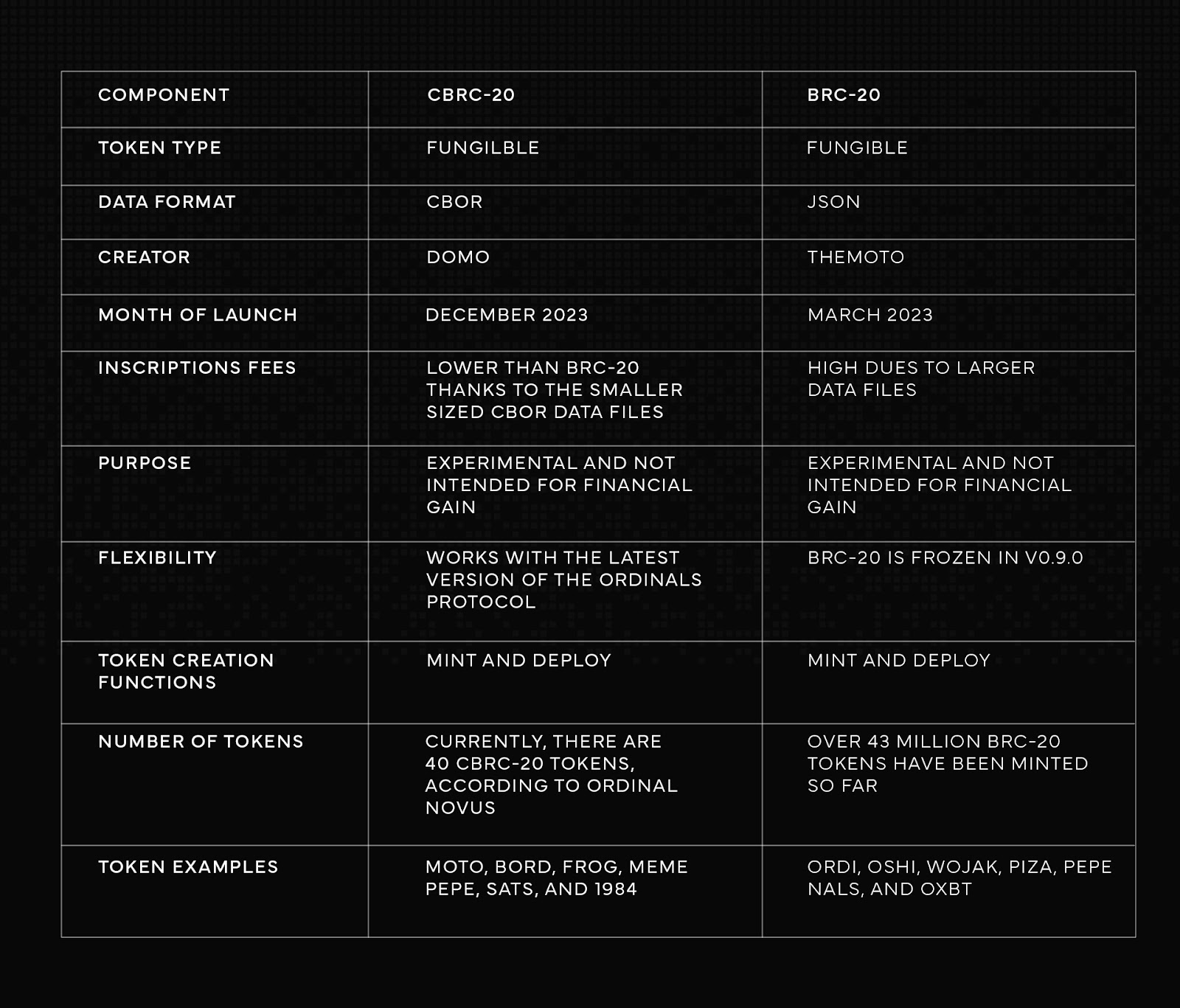 Since this data is described directly in the Ordinal envelope, there is no need to also specify it in the mint and transfer stages, as is with BRC-20. As a result, the CBRC-20 token standard minimizes the cost of minting and transferring inscriptions.