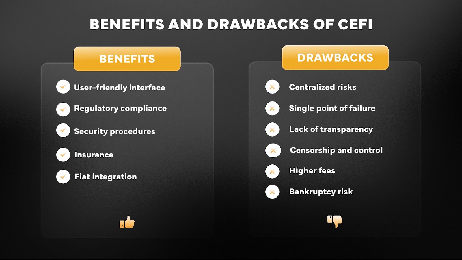 Now, let’s look at some of the benefits and drawbacks of CeFi platforms.