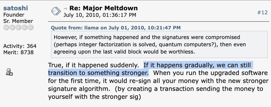 The quantum threat is not new to Bitcoin. Even Satoshi Nakamoto, the pseudonymous creator of Bitcoin, addressed concerns about advancements in quantum computing back in 2010, stating that, “If it happens gradually, we can still transition to something stronger.”