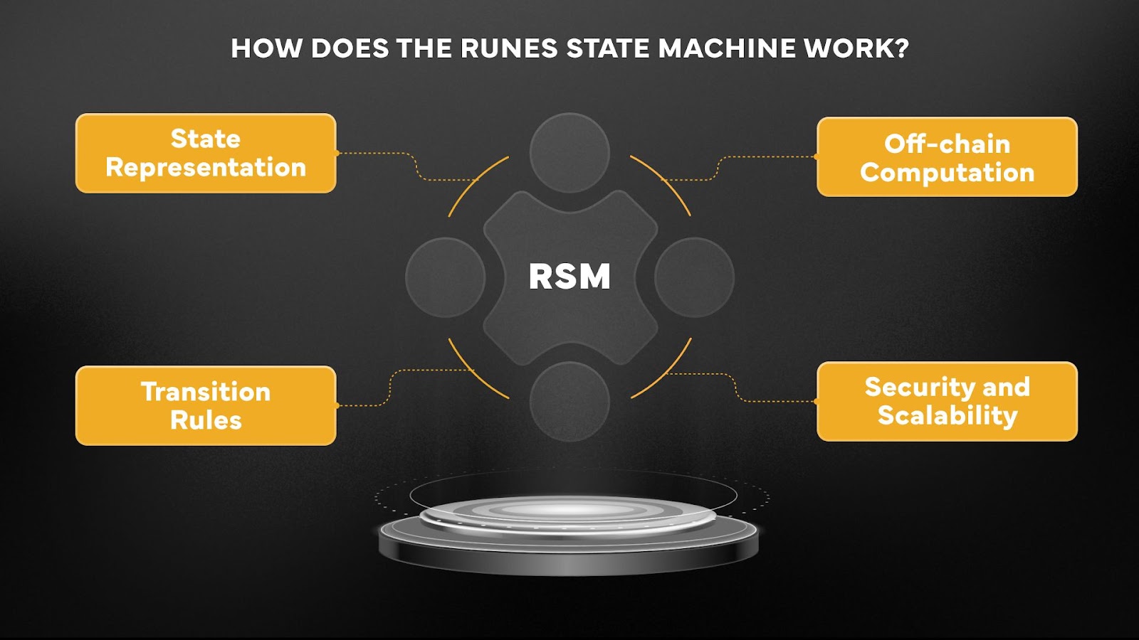 RSM is the runtime environment for each Runes token. These tokens don’t need to be transferred to RSM for computing, while the state update rules are pre-defined in the contract.
