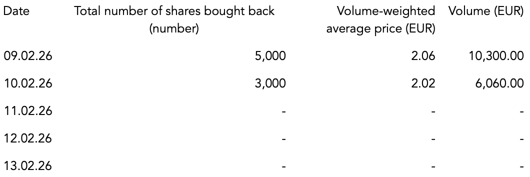In the period from 09 February 2026 up to and including 13 February 2026 were 8,000 shares acquired as part of the share buyback. The start of the share buyback was notified by announcement of 15 September 2025 in accordance with Article 5 of Regulation (EU) No 596/2014 and Article 2(1) of Delegated Regulation (EU) 2016/1052.