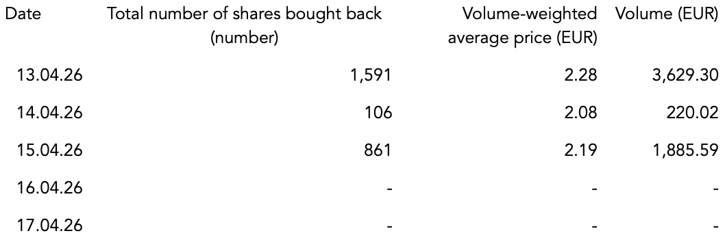 In the period from 13 April 2026 up to and including 17 April 2026 were 2,558 shares acquired as part of the share buyback. The start of the share buyback was notified by announcement of 15 September 2025 in accordance with Article 5 of Regulation (EU) No 596/2014 and Article 2(1) of Delegated Regulation (EU) 2016/1052.