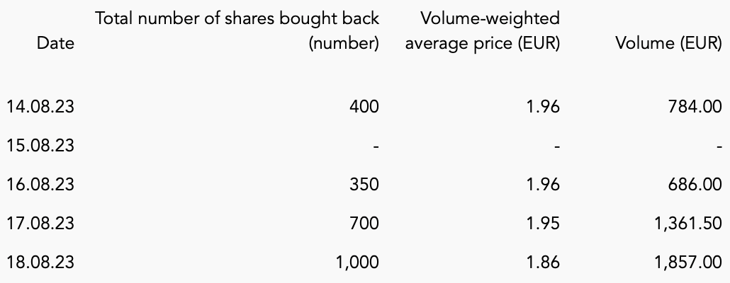 In the period from 14. August 2023 up to and including 18. August 2023 were 2,450 shares acquired as part of the share buyback. The start of the share buyback was notified by announcement of 14 July 2022 in accordance with Article 5 of Regulation (EU) No 596/2014 and Article 2(1) of Delegated Regulation (EU) 2016/1052.