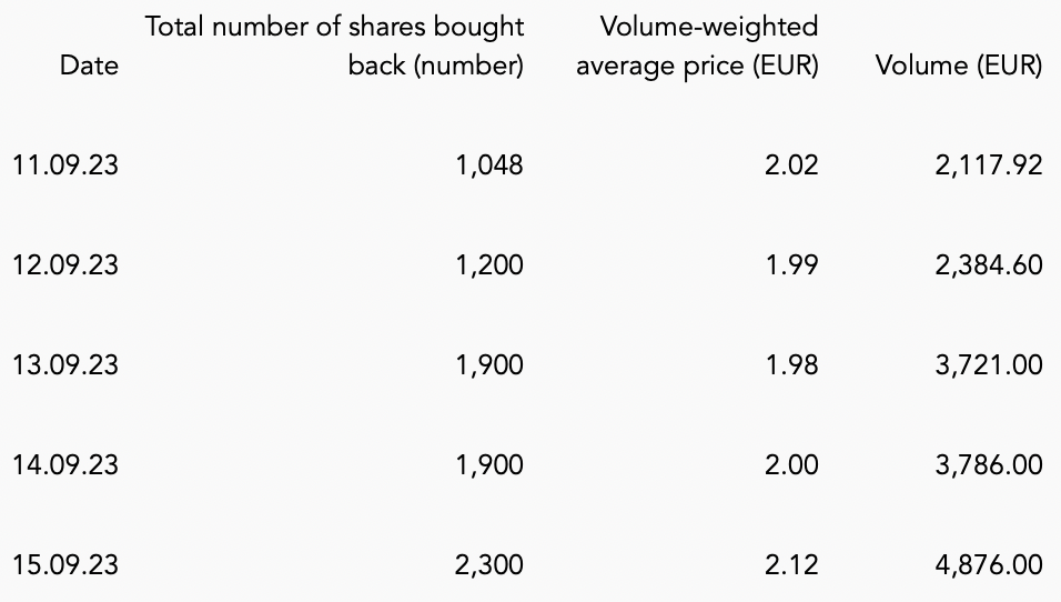 In the period from 11 September 2023 up to and including 15 September 2023 were 51,300 shares acquired as part of the share buyback. The start of the share buyback was notified by announcement of 14 July 2022 in accordance with Article 5 of Regulation (EU) No 596/2014 and Article 2(1) of Delegated Regulation (EU) 2016/1052.