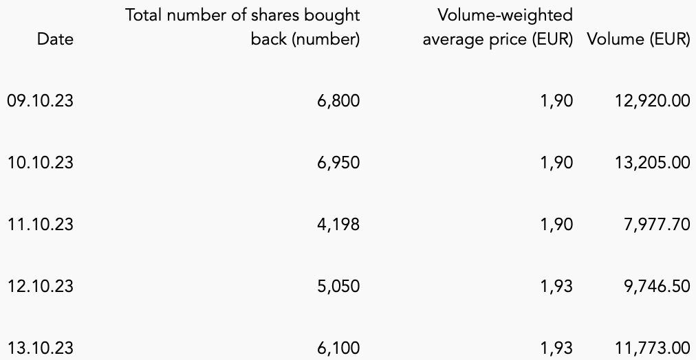 In the period from 09 October 2023 up to and including 13 October 2023 were 29,098 shares acquired as part of the share buyback. The start of the share buyback was notified by announcement of 14 July 2022 in accordance with Article 5 of Regulation (EU) No 596/2014 and Article 2(1) of Delegated Regulation (EU) 2016/1052.