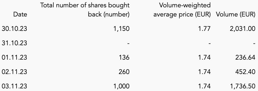 In the period from 30 October 2023 up to and including 03 November 2023 were 2,546 shares acquired as part of the share buyback. The start of the share buyback was notified by announcement of 14 July 2022 in accordance with Article 5 of Regulation (EU) No 596/2014 and Article 2(1) of Delegated Regulation (EU) 2016/1052.