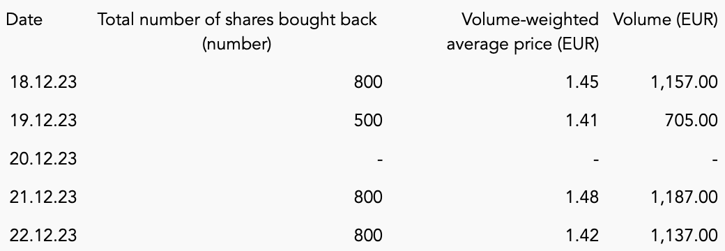 In the period from 18 December 2023 up to and including 22 December 2023 were 2,900 shares acquired as part of the share buyback. The start of the share buyback was notified by announcement of 14 July 2022 in accordance with Article 5 of Regulation (EU) No 596/2014 and Article 2(1) of Delegated Regulation (EU) 2016/1052.