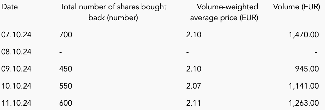 In the period from 07 October 2024 up to and including 11 October 2024 were 2,300 shares acquired as part of the share buyback. The start of the share buyback was notified by announcement of 02 September 2024 in accordance with Article 5 of Regulation (EU) No 596/2014 and Article 2(1) of Delegated Regulation (EU) 2016/1052.