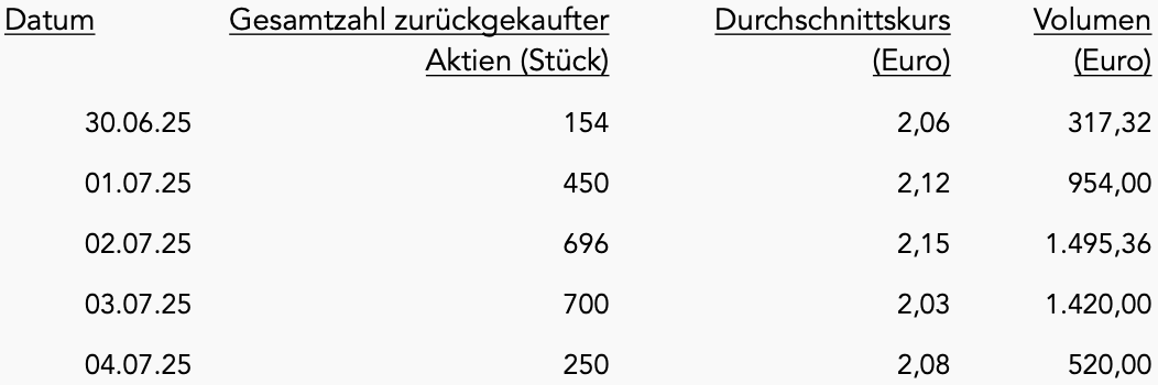 Im Zeitraum vom 30. Juni 2025 bis einschließlich 04. Juli 2025 wurden 2.250 Aktien im Rahmen des Aktienrückkaufs erworben. Der Beginn des Aktienrückkaufs wurde mit Bekanntmachung vom 02. September 2024 gemäß Artikel 5 der Verordnung (EU) Nr. 596/2014 und gemäß Art. 2 Abs. 1 der delegierten Verordnung (EU)2016/1052 mitgeteilt.
