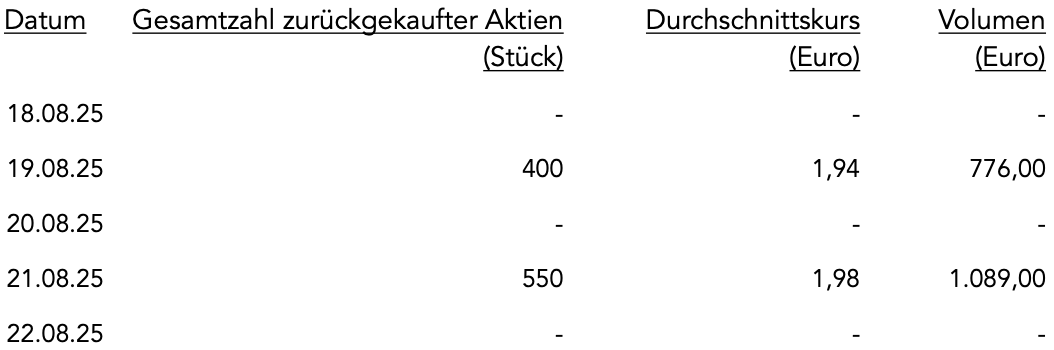 Im Zeitraum vom 18. August 2025 bis einschließlich 22. August 2025 wurden 950 Aktien im Rahmen des Aktienrückkaufs erworben. Der Beginn des Aktienrückkaufs wurde mit Bekanntmachung vom 02. September 2024 gemäß Artikel 5 der Verordnung (EU) Nr. 596/2014 und gemäß Art. 2 Abs. 1 der delegierten Verordnung (EU)2016/1052 mitgeteilt.