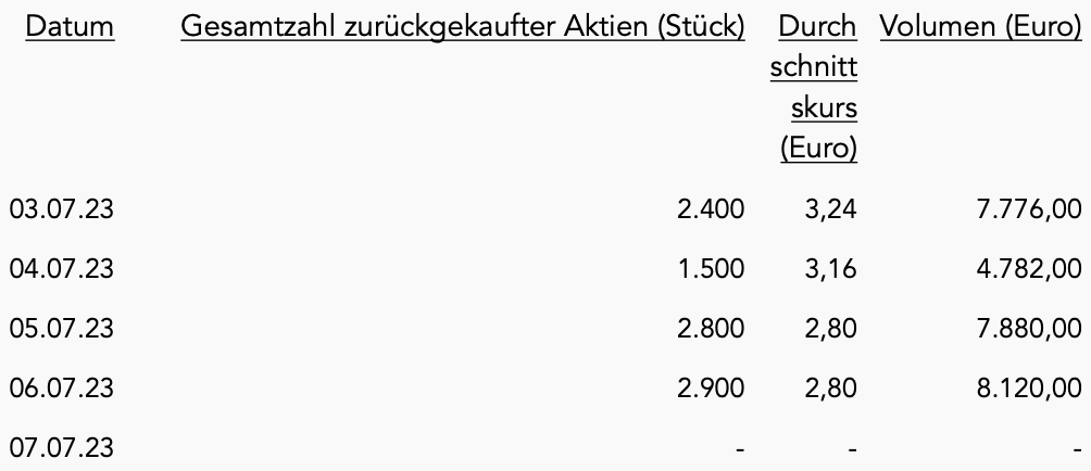 Im Zeitraum vom 03. Juli 2023 bis einschließlich 07. Juli 2023 wurden 9.600 Aktien im Rahmen des Aktienrückkaufs erworben. Der Beginn des Aktienrückkaufs wurde mit Bekanntmachung vom 14. Juli 2022 gemäß Artikel 5 der Verordnung (EU) Nr. 596/2014 und gemäß Art. 2 Abs. 1 der delegierten Verordnung (EU)2016/1052 mitgeteilt.