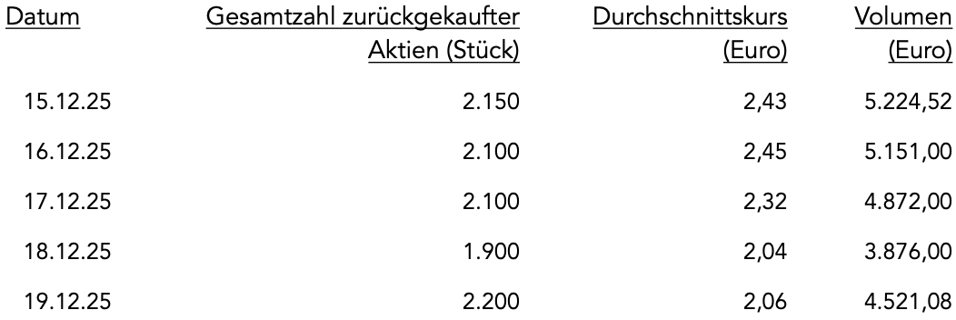 Im Zeitraum vom 15. Dezember 2025 bis einschließlich 19. Dezember 2025 wurden 10.450 Aktien im Rahmen des Aktienrückkaufs erworben. Der Beginn des Aktienrückkaufs wurde mit Bekanntmachung vom 15. September 2025 gemäß Artikel 5 der Verordnung (EU) Nr. 596/2014 und gemäß Art. 2 Abs. 1 der delegierten Verordnung (EU)2016/1052 mitgeteilt.