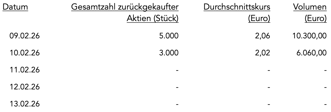 Im Zeitraum vom 09. Februar 2026 bis einschließlich 13. Februar 2026 wurden 8.000 Aktien im Rahmen des Aktienrückkaufs erworben. Der Beginn des Aktienrückkaufs wurde mit Bekanntmachung vom 15. September 2025 gemäß Artikel 5 der Verordnung (EU) Nr. 596/2014 und gemäß Art. 2 Abs. 1 der delegierten Verordnung (EU)2016/1052 mitgeteilt.