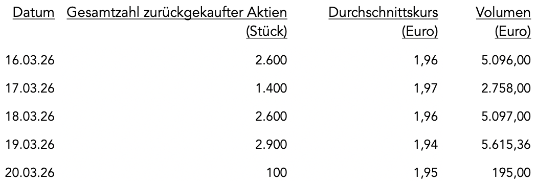 Im Zeitraum vom 16. März 2026 bis einschließlich 20. März 2026 wurden 9.600 Aktien im Rahmen des Aktienrückkaufs erworben. Der Beginn des Aktienrückkaufs wurde mit Bekanntmachung vom 15. September 2025 gemäß Artikel 5 der Verordnung (EU) Nr. 596/2014 und gemäß Art. 2 Abs. 1 der delegierten Verordnung (EU)2016/1052 mitgeteilt.