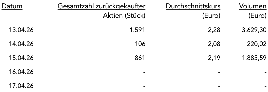 Im Zeitraum vom 13. April 2026 bis einschließlich 17. April 2026 wurden 2.558 Aktien im Rahmen des Aktienrückkaufs erworben. Der Beginn des Aktienrückkaufs wurde mit Bekanntmachung vom 15. September 2025 gemäß Artikel 5 der Verordnung (EU) Nr. 596/2014 und gemäß Art. 2 Abs. 1 der delegierten Verordnung (EU)2016/1052 mitgeteilt.