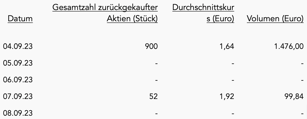 Im Zeitraum vom 04. August 2023 bis einschließlich 08. September 2023 wurden 952 Aktien im Rahmen des Aktienrückkaufs erworben. Der Beginn des Aktienrückkaufs wurde mit Bekanntmachung vom 14. Juli 2022 gemäß Artikel 5 der Verordnung (EU) Nr. 596/2014 und gemäß Art. 2 Abs. 1 der delegierten Verordnung (EU)2016/1052 mitgeteilt.