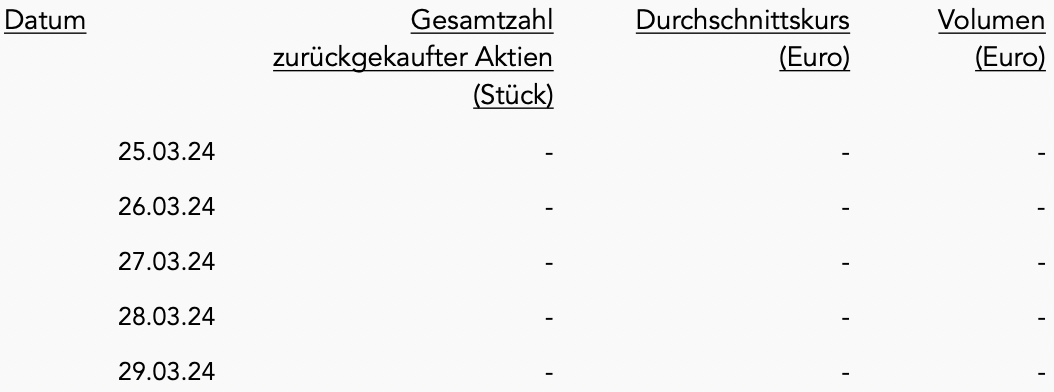 Im Zeitraum vom 25. März 2024 bis einschließlich. 29 März 2024 wurden 0 Aktien im Rahmen des Aktienrückkaufs erworben. Der Beginn des Aktienrückkaufs wurde mit Bekanntmachung vom 14. Juli 2022 gemäß Artikel 5 der Verordnung (EU) Nr. 596/2014 und gemäß Art. 2 Abs. 1 der delegierten Verordnung (EU)2016/1052 mitgeteilt.