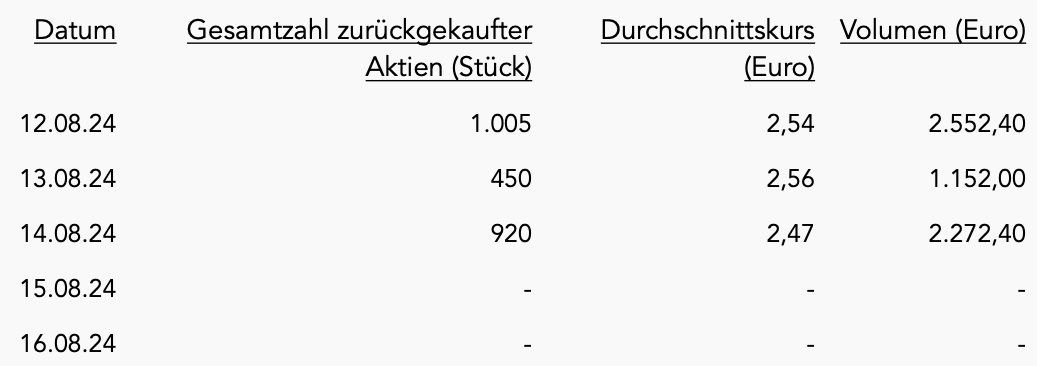 Im Zeitraum vom 12. August 2024 bis einschließlich 16 August 2024 wurden 2.375 Aktien im Rahmen des Aktienrückkaufs erworben. Der Beginn des Aktienrückkaufs wurde mit Bekanntmachung vom 17. Juli 2024 gemäß Artikel 5 der Verordnung (EU) Nr. 596/2014 und gemäß Art. 2 Abs. 1 der delegierten Verordnung (EU)2016/1052 mitgeteilt.