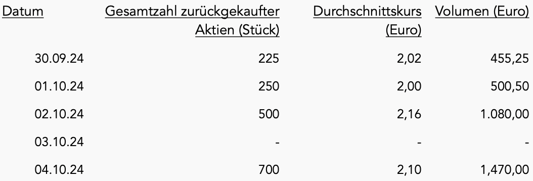 Im Zeitraum vom 30. September 2024 bis einschließlich 04 Oktober 2024 wurden 1.675 Aktien im Rahmen des Aktienrückkaufs erworben. Der Beginn des Aktienrückkaufs wurde mit Bekanntmachung vom 02. September 2024 gemäß Artikel 5 der Verordnung (EU) Nr. 596/2014 und gemäß Art. 2 Abs. 1 der delegierten Verordnung (EU)2016/1052 mitgeteilt.