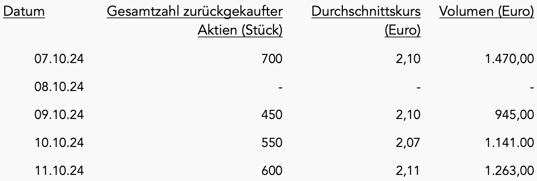 Im Zeitraum vom 07. Oktober 2024 bis einschließlich 11 Oktober 2024 wurden 2.300 Aktien im Rahmen des Aktienrückkaufs erworben. Der Beginn des Aktienrückkaufs wurde mit Bekanntmachung vom 02. September 2024 gemäß Artikel 5 der Verordnung (EU) Nr. 596/2014 und gemäß Art. 2 Abs. 1 der delegierten Verordnung (EU)2016/1052 mitgeteilt.