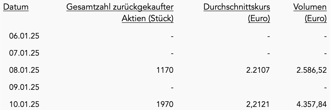 Im Zeitraum vom 06 Januar 2025 bis einschließlich 10. Januar 2025 wurden 3.140 Aktien im Rahmen des Aktienrückkaufs erworben. Der Beginn des Aktienrückkaufs wurde mit Bekanntmachung vom 02. September 2024 gemäß Artikel 5 der Verordnung (EU) Nr. 596/2014 und gemäß Art. 2 Abs. 1 der delegierten Verordnung (EU)2016/1052 mitgeteilt.