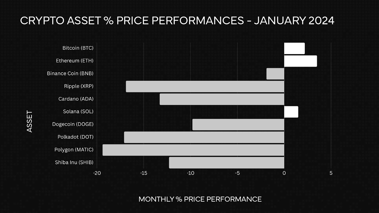 Bitcoin continued its impressive run from 2023 into the new year. The biggest news of the month was the spot Bitcoin ETF approvals in the U.S., which took place on January 10th. Trading started the next day.