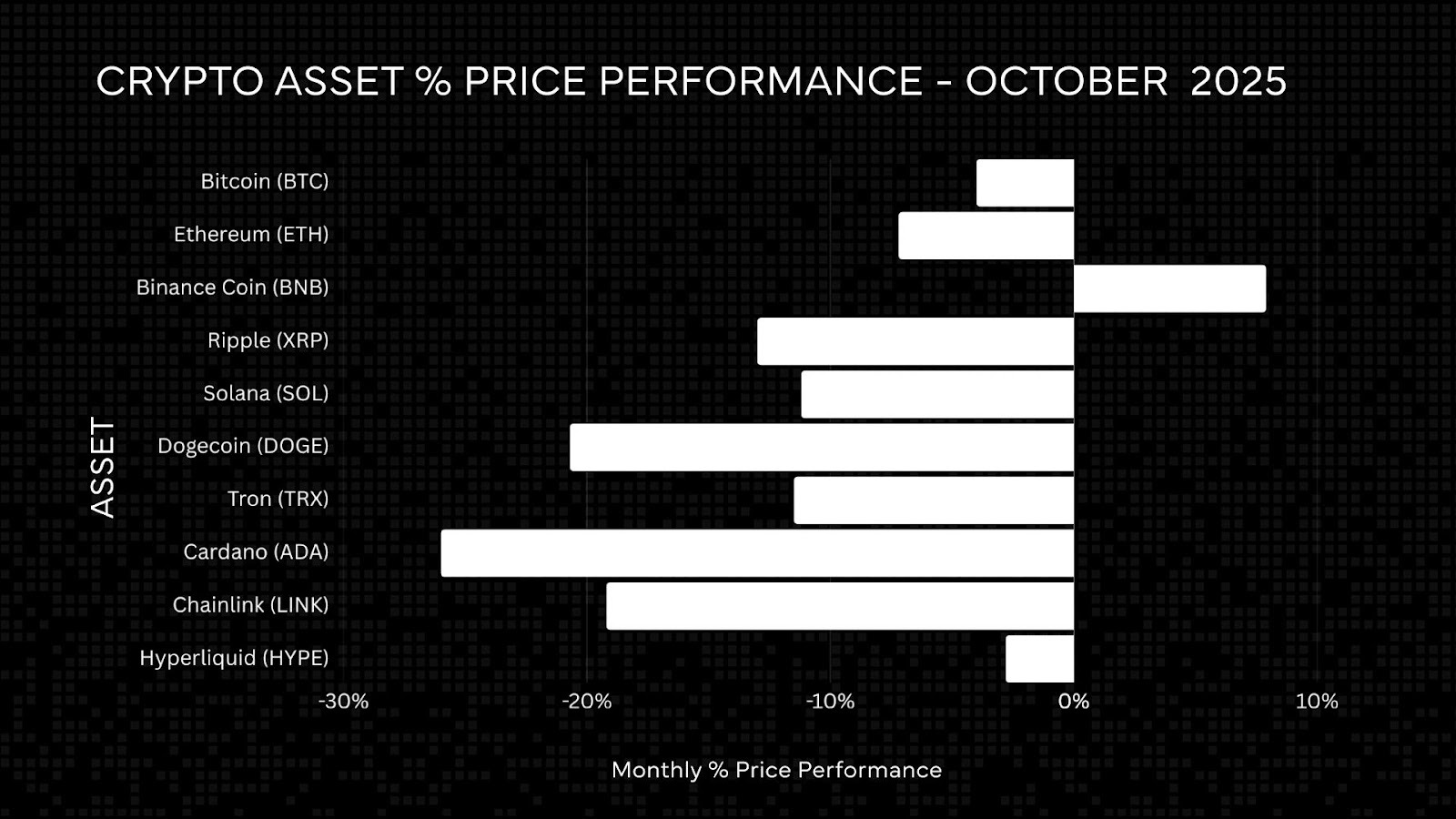 The only cryptocurrency to end the month in the green was Binance (BNB) at 7.8%. The BNB token reached a new all-time high of $1,369.99 on October 13. Binance secured a partnership in Kazakhstan, collaborating with the country's Alem crypto fund.