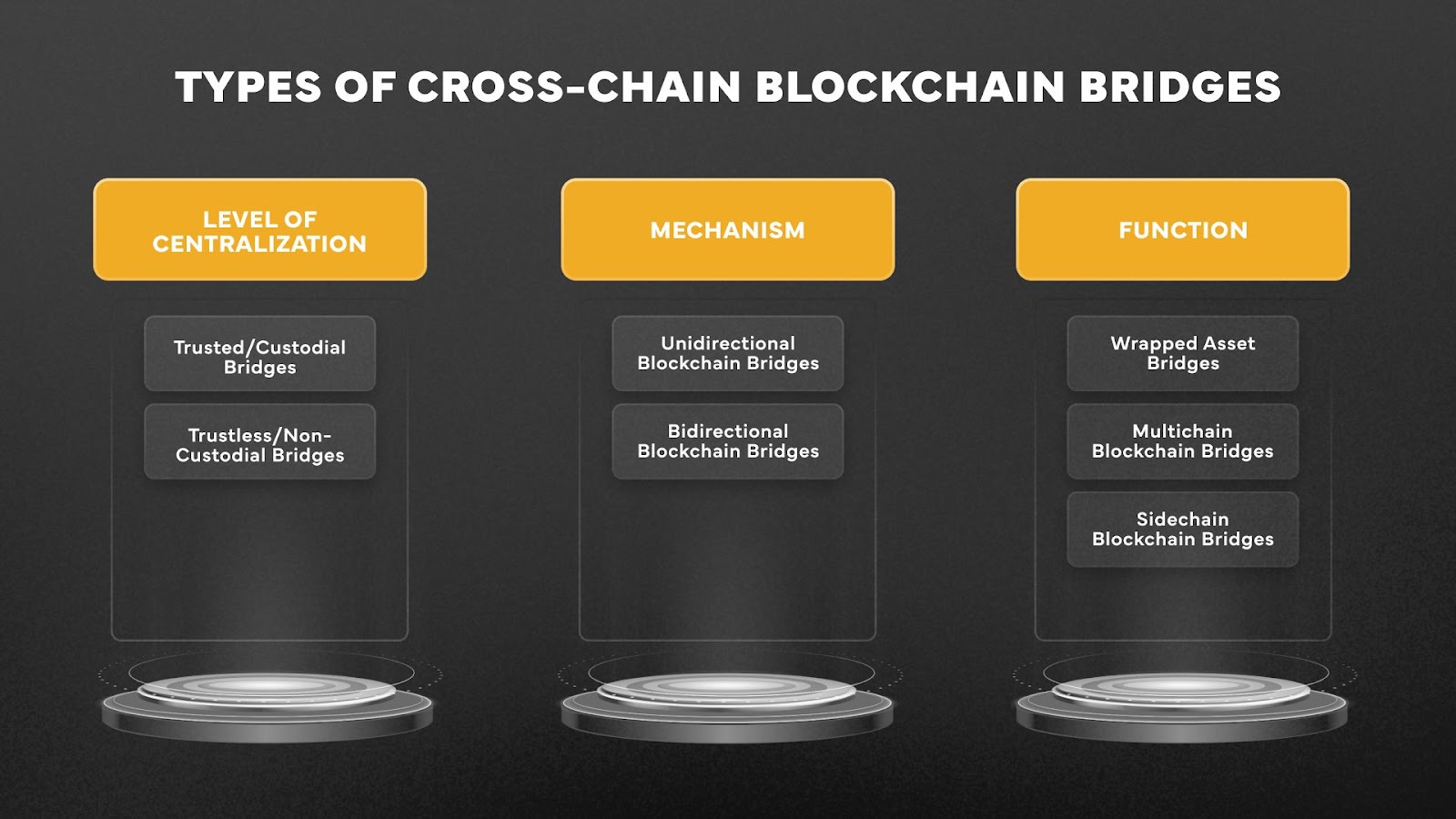 Blockchain bridges can be categorized by function, level of centralization, and mechanism. Let’s take a look at the different types of bridges in the market.