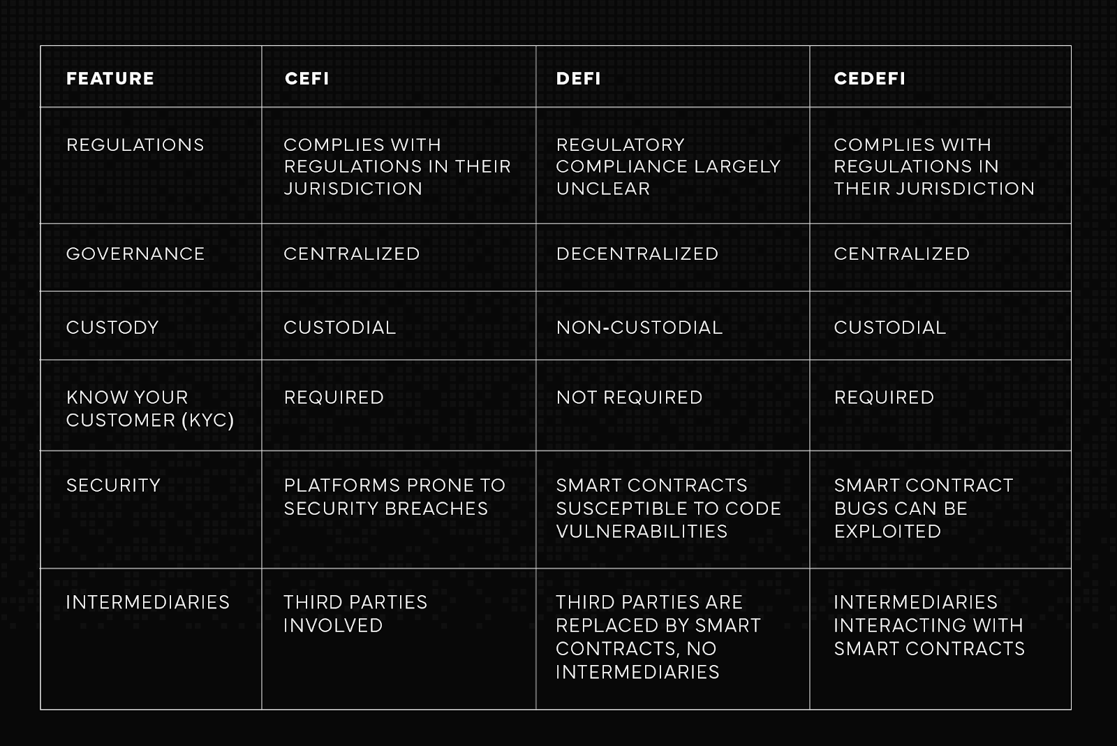 The CeDeFi ecosystem draws custodial governance and decision-making from CeFi and complies with jurisdictional regulations similar to traditional systems. Additionally, CeDeFi channels DeFi by providing transaction transparency, fast onboarding processes, and on-chain security.